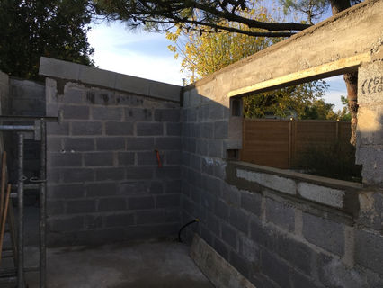 Pour cela nous avons travaillé sur un garage existant laissé à l'abandon. Réhausse des murs périphériques en parpaing, nouvelle charpente à un pan recouverte de zinc, remplacement et création de nouvelles menuiseries extérieures et aménagement intérieur : résultat une suite chambre et salle d'eau avec toilette indépendant.