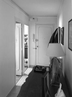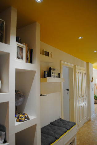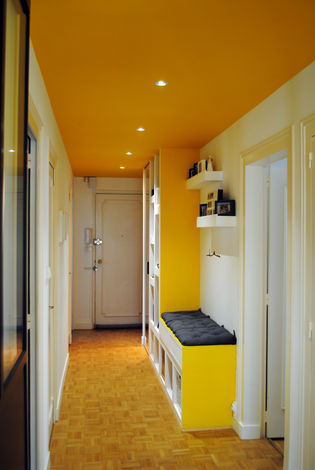 Au lieu de nier la longueur du couloir, je décide au contraire de la mettre en valeur comme un élément majeur. Je choisi de créer un faux plafond légèrement surbaissé qui accompagne le regard jusqu'à la fenêtre en bout de perspective et permet au passage d'intégrer tous les réseaux laissés jusqu'alors apparents. D'un jaune vif, cette ligne graphique au plafond ramène de la lumière dans cet espace de distribution en second jour.