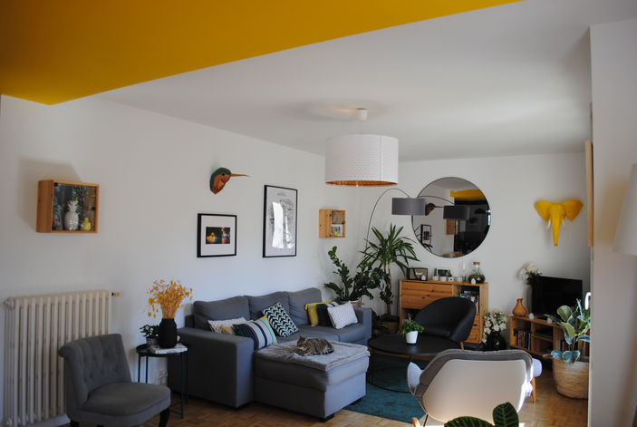 Côté espace à vivre, ma cliente souhaitait conserver une cuisine fermée pour les odeurs, je lui propose alors de réaliser une verrière sur mesure avec deux portes coulissantes pour fluidifier la circulation avec la salle à manger. Le reste des cloisons est abattu, et le plafond jaune divise les espaces sans les clore.
